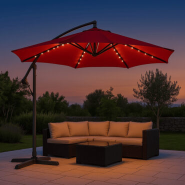 Κρεμαστή Ομπρέλα με Ηλιακό Φωτισμό LED & Μεταλλική Βάση Κόκκινη